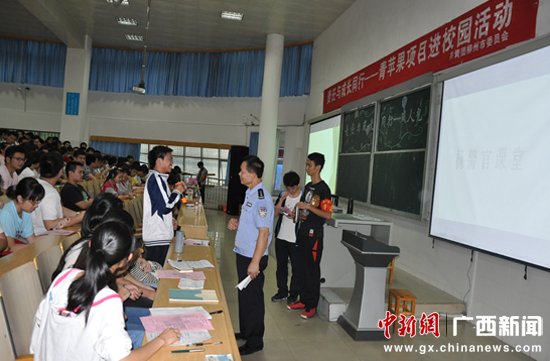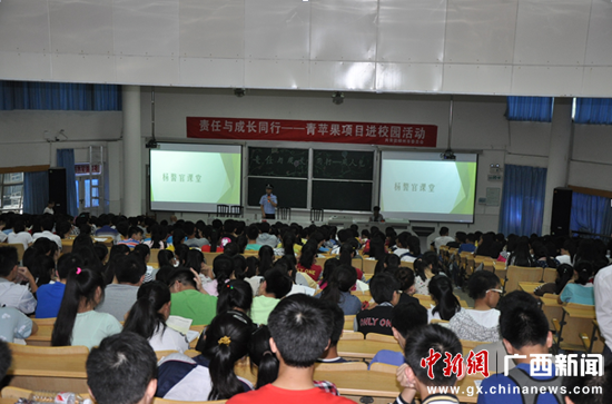 中新广西网电(梁荫发 樊鸿洋)日前,共青团柳州市委员会为全面维护青少年合法权益,切实预防青少年违法犯罪,在柳州市第一中学举办十八岁“成人礼”启动仪式暨“责任与成长同行??青苹果项目进校园” 活动,公安部二级英模、柳州铁路公安处治安五大队民警杨顺德应邀参加了启动仪式并作了演讲报告。